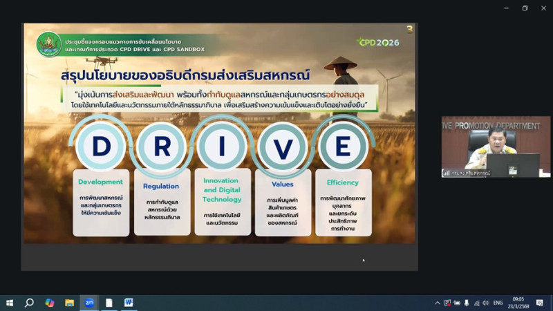 วันที่ 23 มีนาคม 2569 เวลา 09.00 น. นายนฤทธิ์ บุญชัย รองอธิบดีกรมส่งเสริมสหกรณ์ เป็นประธานในการประชุมชี้แจงกรอบแนวทางการขับเคลื่อนนโยบาย และเกณฑ์การประกวด CPD DRIVE และ CPD SANDBOX ประจำปีงบประมาณ พ.ศ. 2569 ผ่านระบบออนไลน์ Zoom Meeting